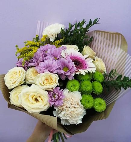 Таинственный, магический и притягательный, именно так хочется описать букет "Магия". Белые розы разбавленные хризантемами, гвоздикой, герберой и зеленью наполняют этот букет определенным смыслом. Такое сочетание будет хорошим подарком для мудрой, умной женщины, мамы, бабушки, родственницы или знакомой.